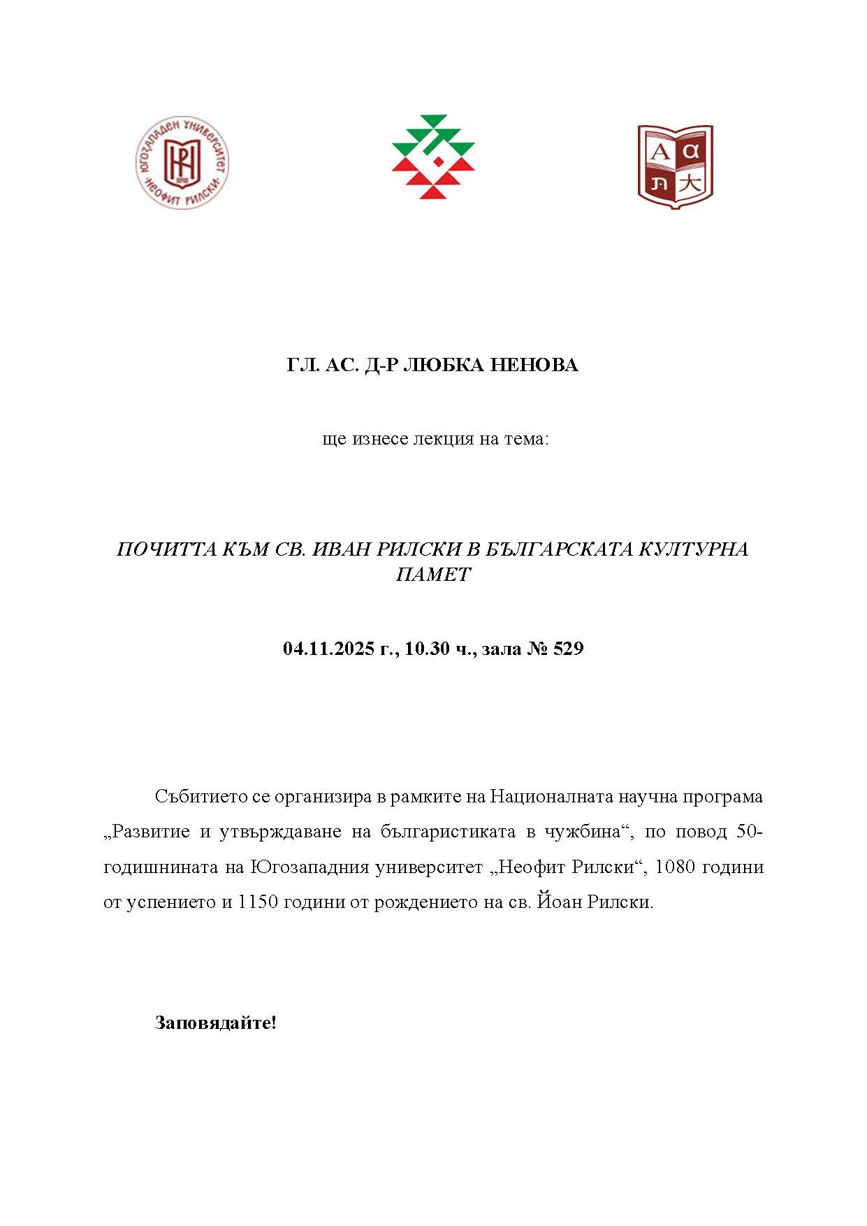 На 4 ноември от 10.30 ч. в зала № 529 гл. ас. д-р Любка Ненова от Катедрата по български език към Филологическия факултет ще изнесе лекция на тема „Почитта към св. Иван Рилски в българската културна памет“.