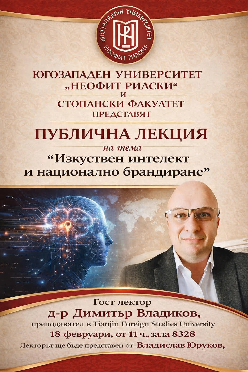 Д-р Димитър Владиков, преподавател в Tianjin Foreign Studies University, ще изнесе публична лекция на тема „Изкуствен интелект и национално брандиране“ в Стопанския факултет.