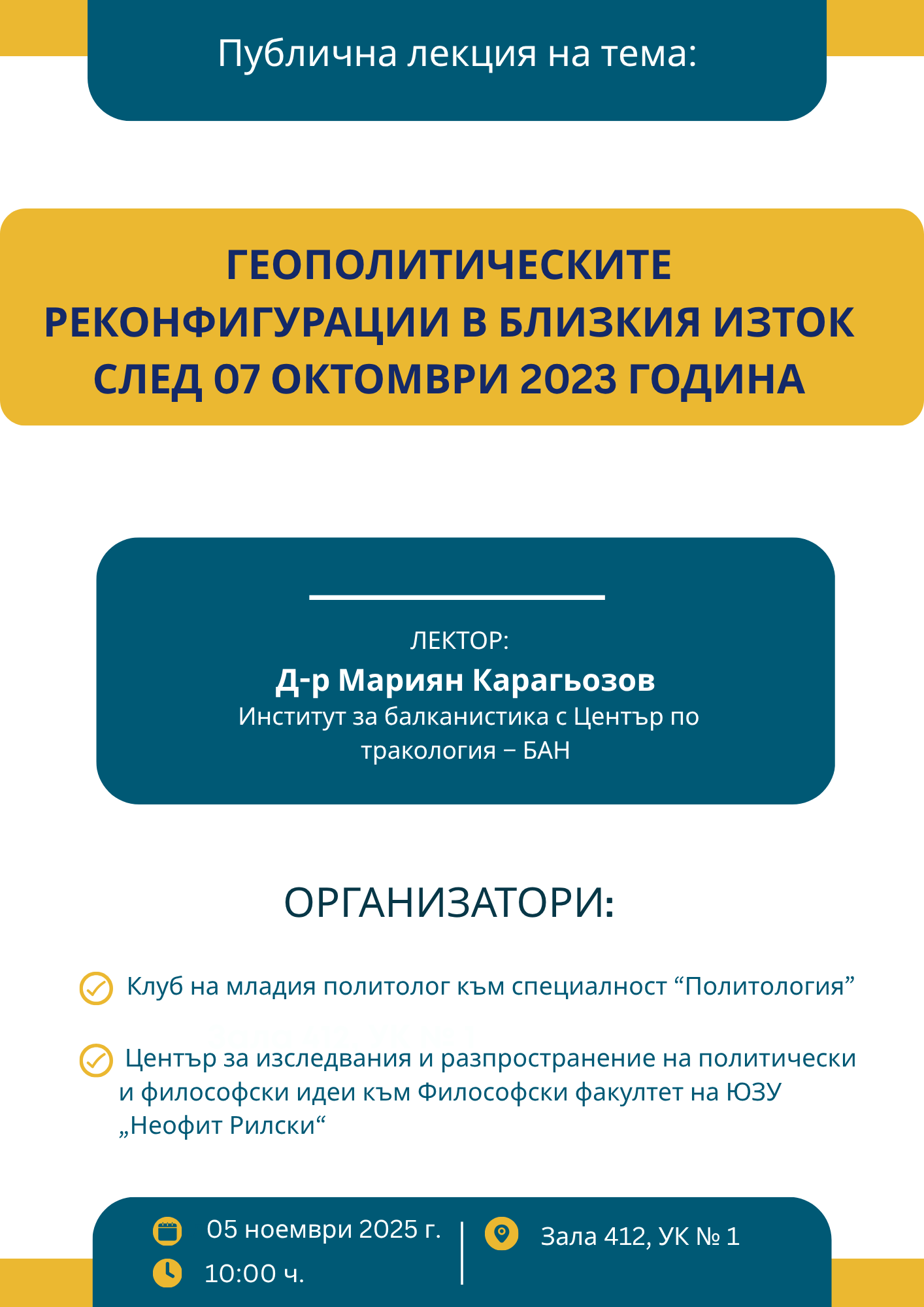Д-р Мариян Карагьозов от Института за балканистика с Център по тракология – БАН ще изнесе публична лекция на тема „Геополитическите реконфигурации в Близкия изток след 7 октомври 2023 г.“.