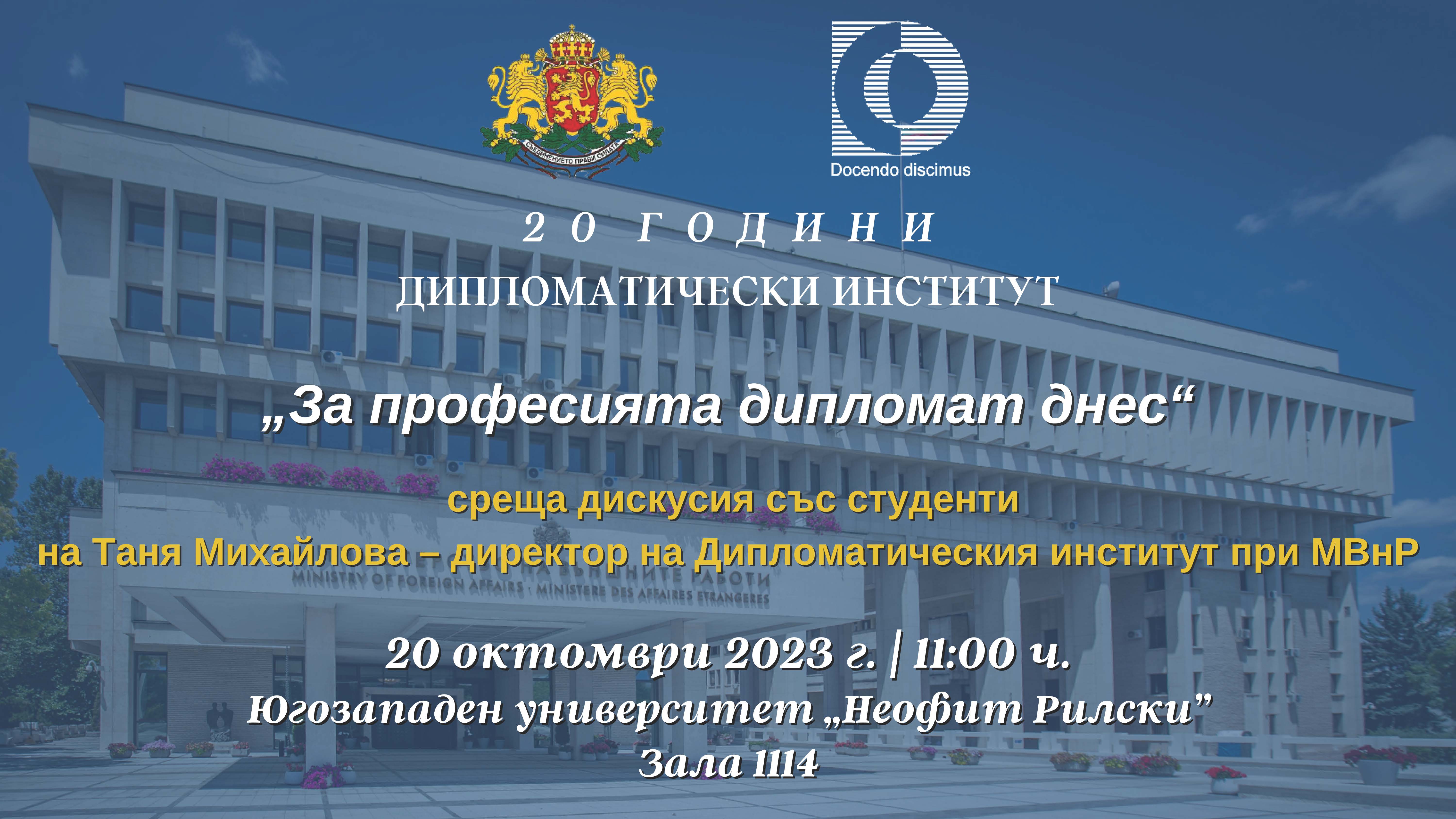 Дипломатическият институт организира среща дискусия със студенти и преподаватели от Югозападен университет „Неофит Рилски“ под надслов „За професията дипломат днес“, която ще се проведе на 20 октомври 2023 година от 11:00 ч. в зала 114 (Учебен корпус № 1).