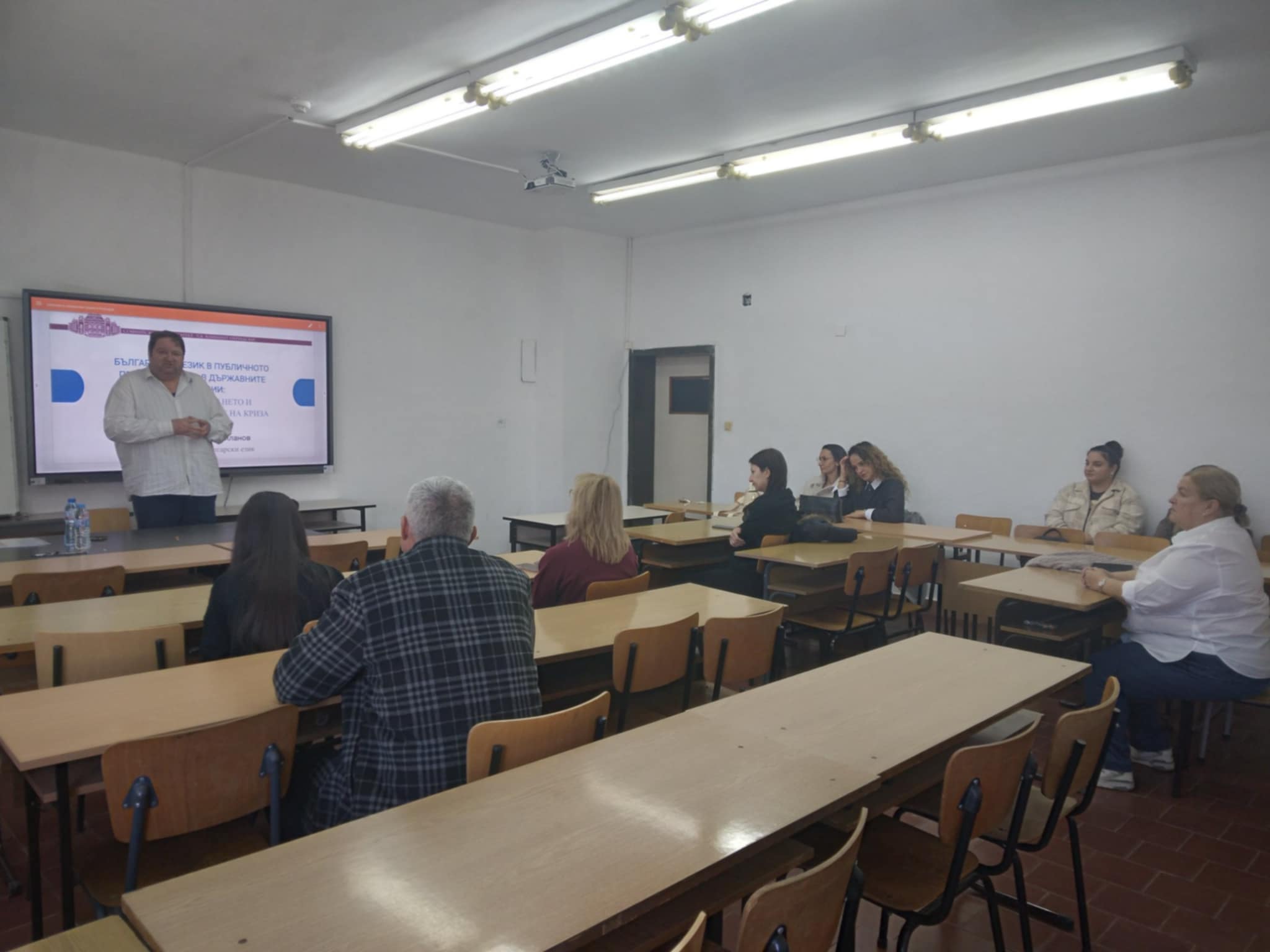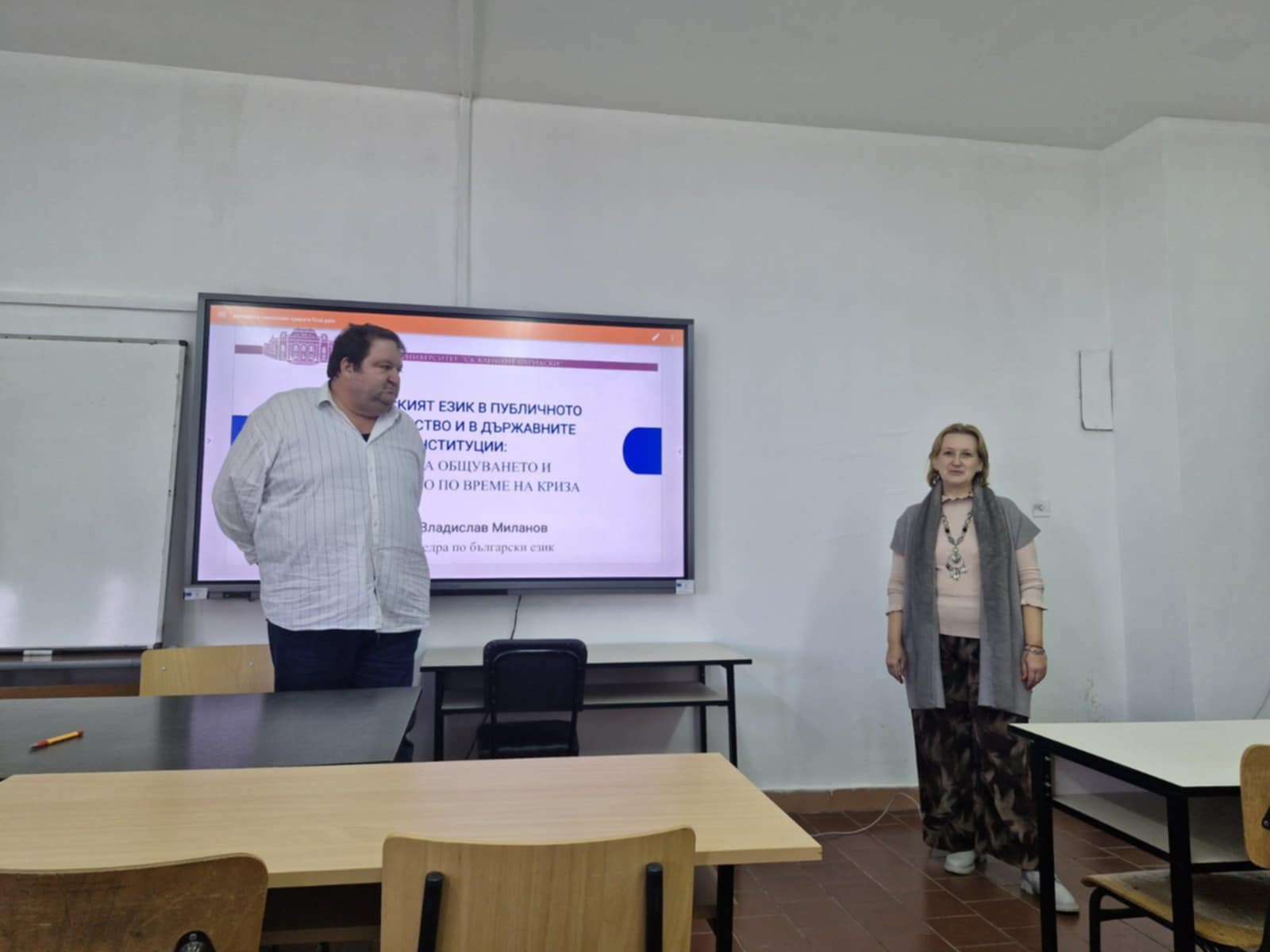 Доц. д-р Владислав Миланов от Софийския университет „Св. Климент Охридски“ изнесе лекция на тема „Българският език в публичното пространство и в държавните институции: кризи на общуването и общуването по време на криза“. Лекторът представи данни от проведена анкета сред 200 респонденти на средна възраст 21 години във връзка с начините им за информиране и новините, които ги вълнуват. Стана ясно, че 145 анкетирани са заявили, че се интересуват от новини, като откриват информация основно през телефоните си и онлайн източници, а останалите анкетирани са посочили, че не се интересуват от новини.