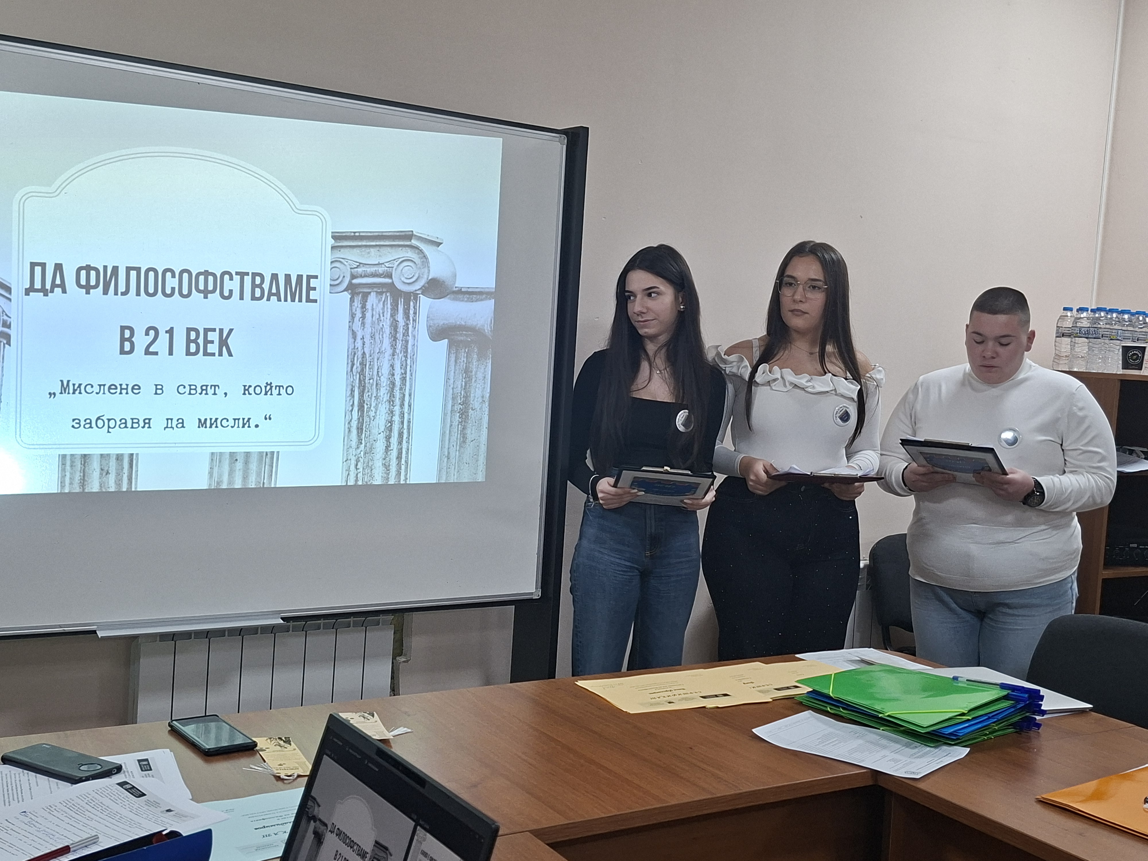 Учениците – младите хора, които днес все по-смело търсят своя път в бързо променящия се свят, бяха подготвили есета, презентации и кратък филм по впечатляващо широк кръг философски теми. Сред тях бяха: „Да обичаш мъдростта в XXI век!?“, „Да създаваш и откриваш духовни пространства…“, „Въпросите, които не мога да не задам“, „Философското удивление“ и „Философия на търговията и как тя променя света“.