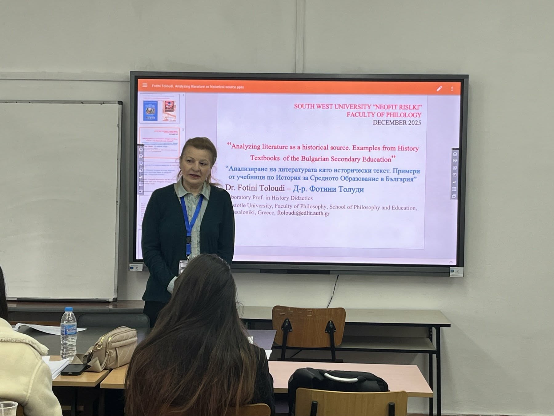 Д-р Фотини Толуди в своята лекция коментира литературата като исторически текст въз основа на примери от българските учебници по история. В препълнената 1531 аудитория д-р Толуди демонстрира възможностите, които дава дискурсивният анализ за опознаване не просто на миналото, но и на съвременния човек да погледне в себе си и мястото си в света.